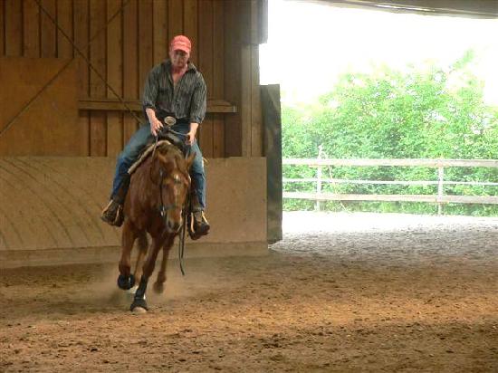 Hier meine Co-trainerin Violette Lacey. Sie bekommt gerade Erfahrung mit fortgeschrittenen Pferden, und verbringt gleichzeitig Quailityzeit mit ihrem Papa. Jeder reining Trainer weiss, dass das Allererste, was man uberwinden muss, ist den Tendenz bei Spins schwindlig zu werden.